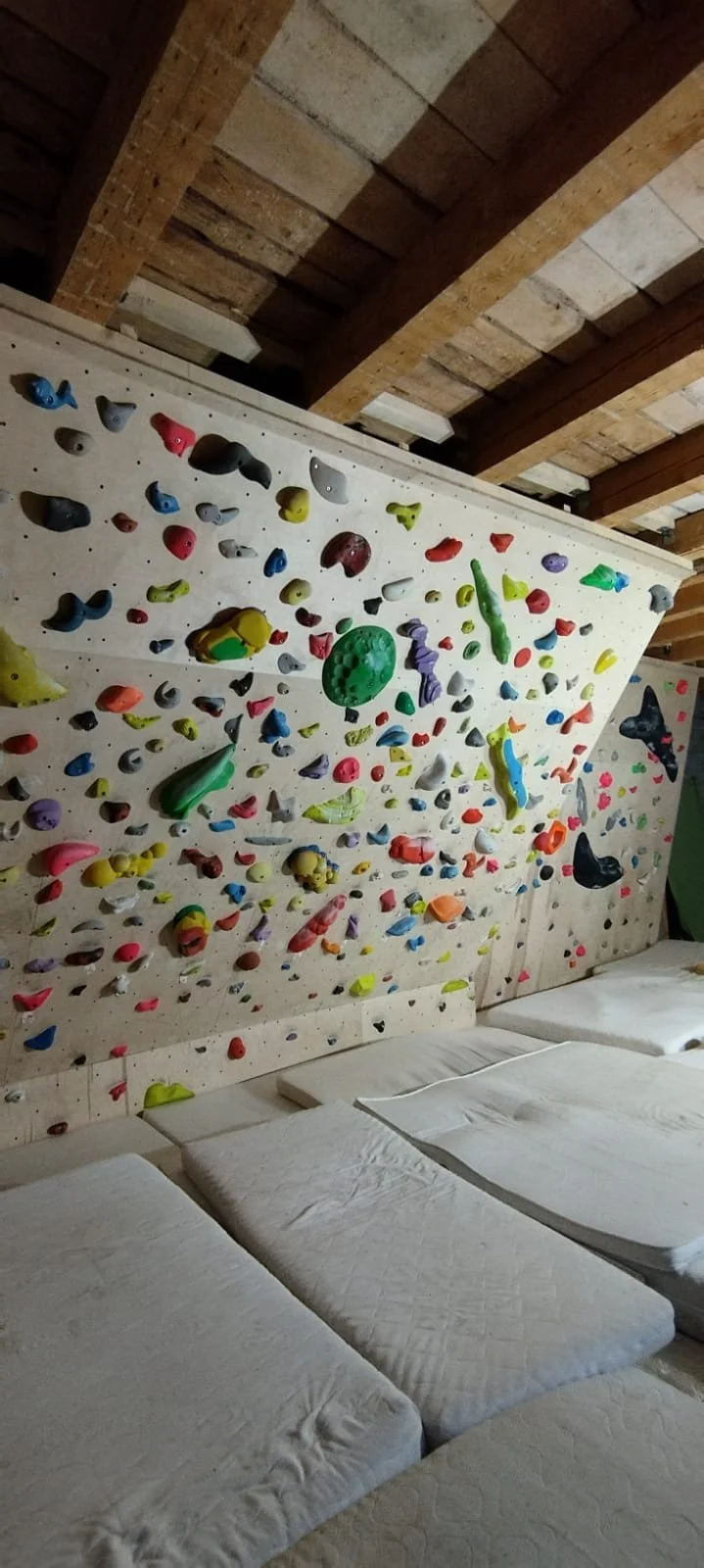 5A - 7C když není kam si zalízt Stěna je 12m široká, 4m vysoká a má dva sklony 15° a 30° a najdete u nás cesty 5A - 7C.